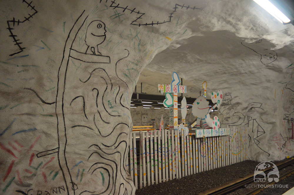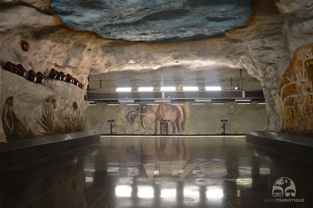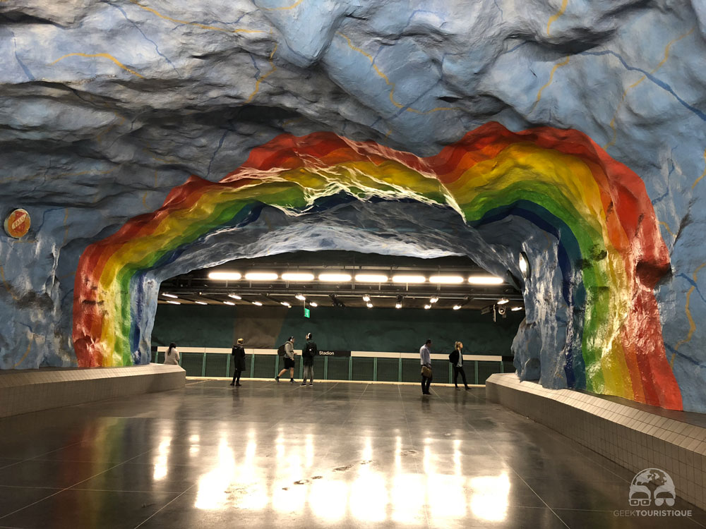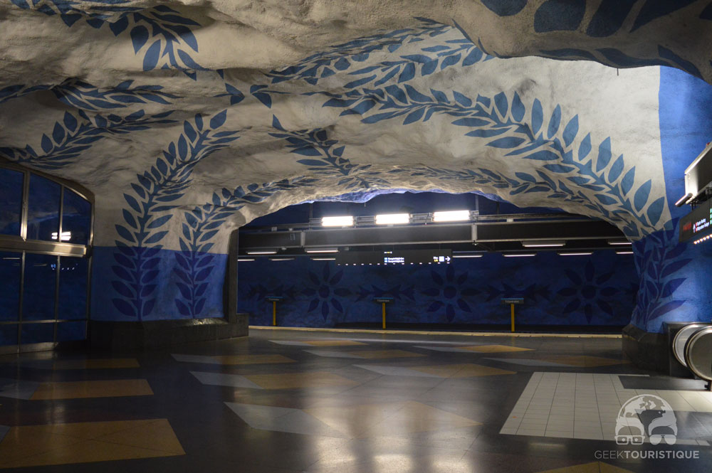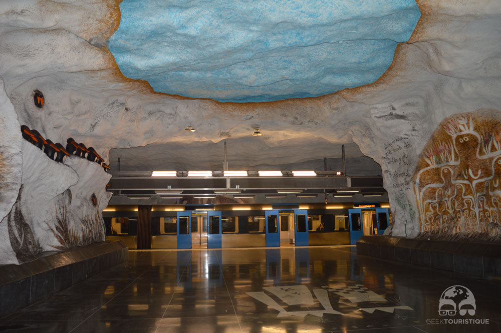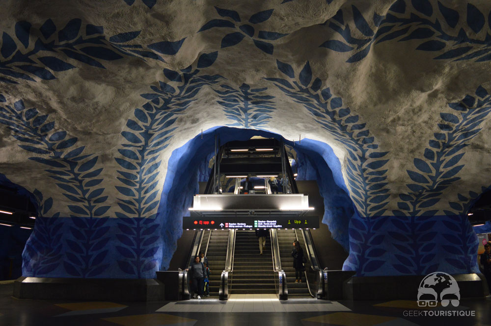 Stockholm, c’est un peu la ville du design (ou au moins d’Ikea quoi). Mais il y a un truc hyper réputé chez eux : les stations de métro. Sur visitStockholm.com on a répertorié toutes les stations de métro qu’il fallait absolument voir… 14 stations sont censées valoir le coup d’œil (en vrai, il y en a bien d’autres qui méritent un petit arrêt, on te laisse te perdre au grès des lignes pour les découvrir !) ! C’est donc dans le métro que nous avons passé notre première journée… et franchement ça vaut vraiment le coup, juge plutôt :